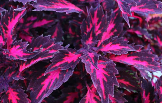 Vibrant burgundy leaves with a hot pink center and serrated purple edge.