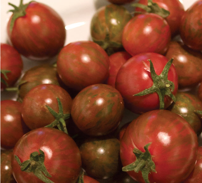 Compact, determinate. Red and green striped fruits with dark red, firm, tangy and flavorful flesh. 1″ t0 1.5″ cherry-sized fruits